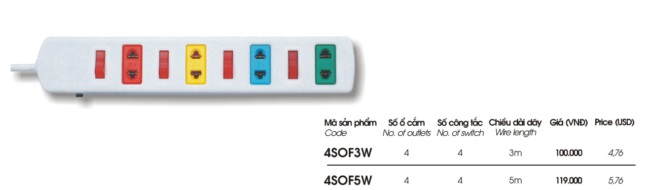 Ổ cắm kéo dài phổ thông 2200w 4 ổ 4 công tắc trắng